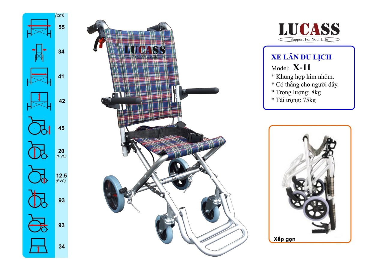 – Lucass X-11 là dòng xe lăn tay du lịch, gấp gọn khung xe lại được, trọng lượng xe rất nhẹ chỉ nặng 8kg nên dễ dàng mang theo khi đi picnic, du lịch…